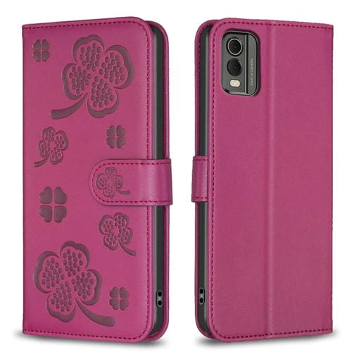 Funda para Teléfono Nokia C12 de Cuero con Relieve de Cuatro Hojas (Rojo Rosa)