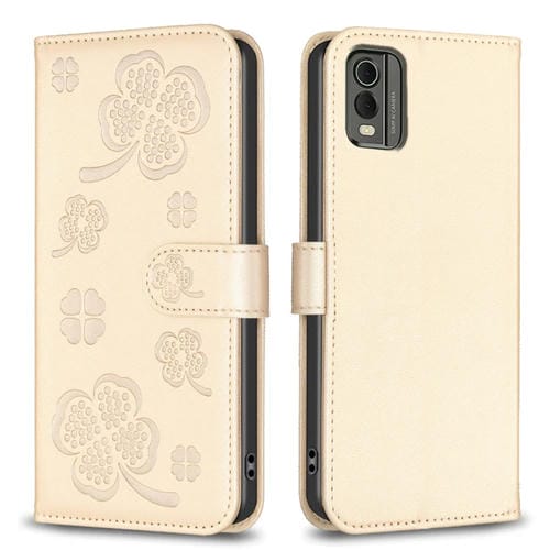 Funda de Cuero para Nokia C32 con Relieve de Cuatro Hojas (Dorado)