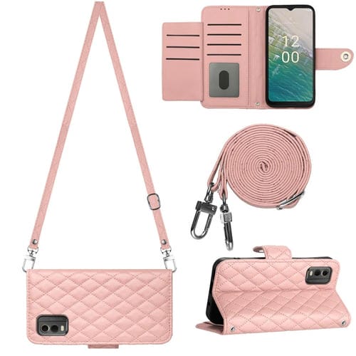 Funda de Cuero para Nokia C32 con Tapa Textura Rómbica y Cordón Largo (Rosa Coral)