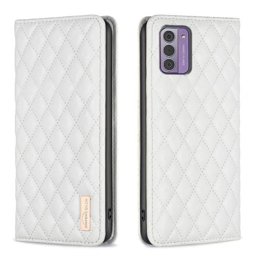 Funda de Cuero para Nokia G42/G310 con Tapa Magnética y Diseño Diamond Lattice (Blanco)