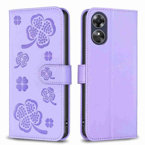 Para Oppo A17 Funda de Cuero con Relieve de Cuatro Hojas (Púrpura)