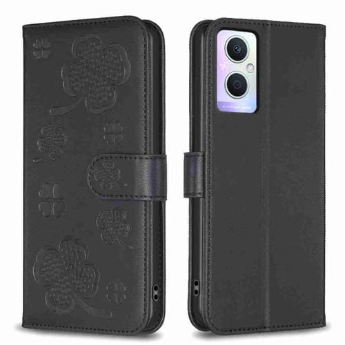 Para Oppo A96 5G / Reno7 Z Funda para Teléfono de Cuero con Relieve de Cuatro Hojas (Negro)