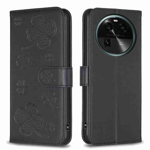 Para Oppo Find X6 Funda de Cuero con Relieve de Cuatro Hojas (Negro)