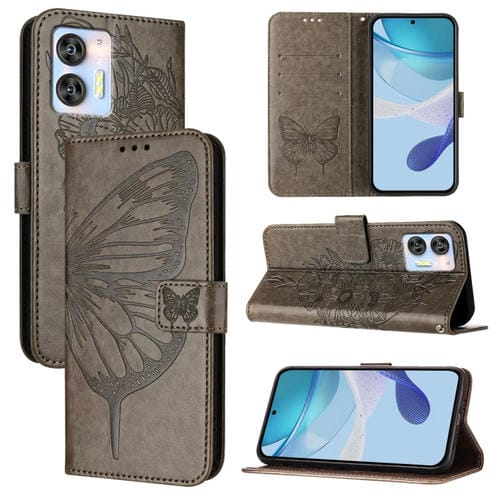 Funda de Cuero para Teléfono Oukitel C36 / C35 con Mariposa en Relieve (Gris)