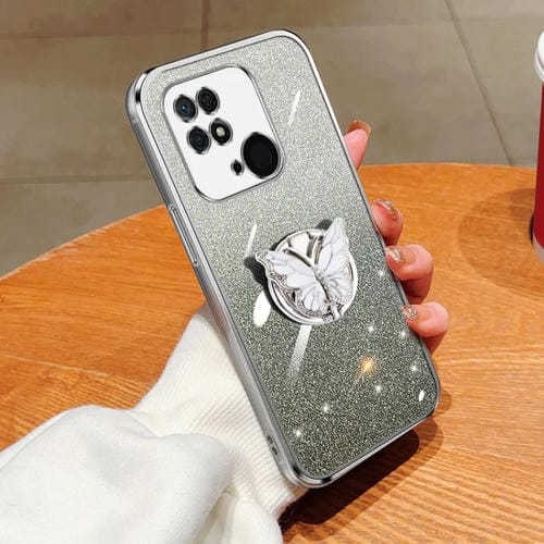 Para Redmi 10C Funda para Teléfono de TPU con Soporte de Mariposa con Brillo Degradado Plateado (Plata)