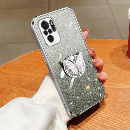 Para Redmi Note 10 4G Funda para Teléfono de TPU con Soporte de Mariposa con Brillo Degradado Plateado (Plata)