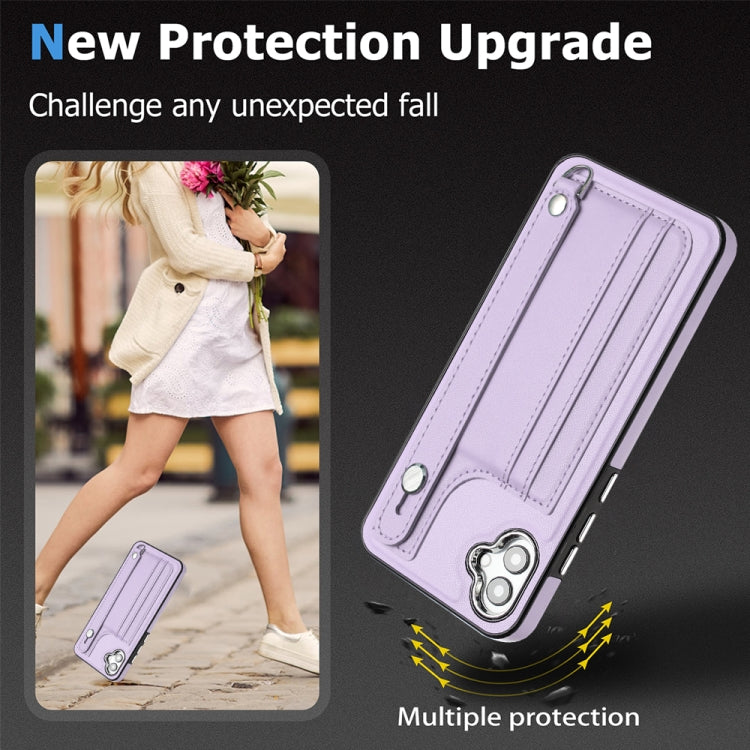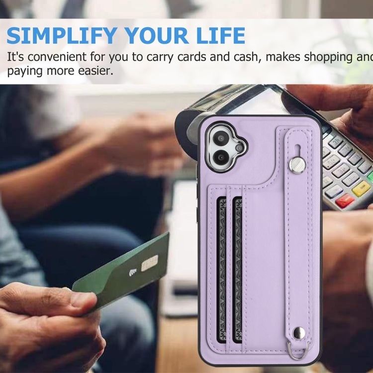 Estuche de teléfono Samsung Galaxy A04E F04 M04 cuero a prueba de golpes con correa para la muñeca (Púrpura)