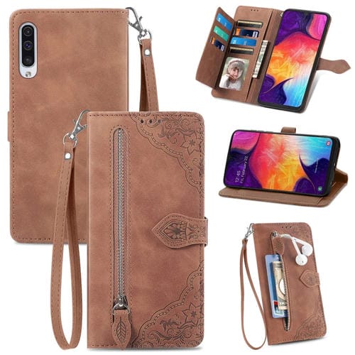 Funda de Cuero para Samsung Galaxy A15 con Cremallera y Flores en Relieve (Marrón)