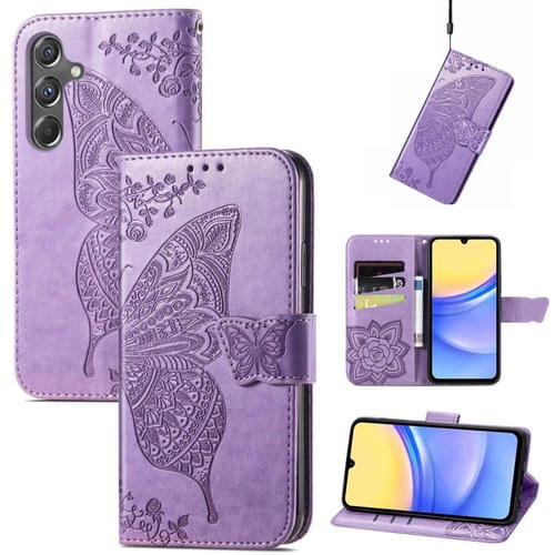 Funda para Teléfono Samsung Galaxy A15 Cuero Relieve Flor de Amor y Mariposa (Lavanda)