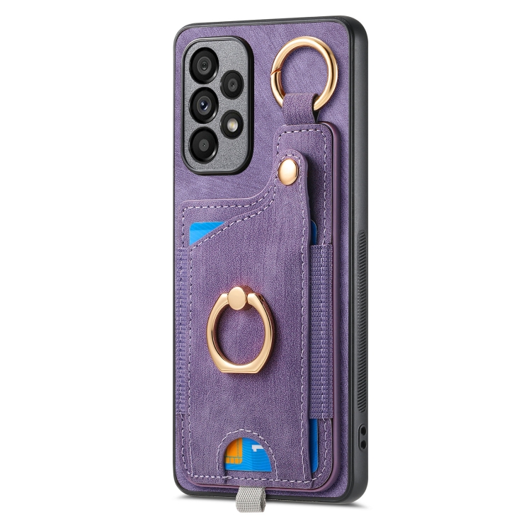 Funda para Teléfono Samsung Galaxy A24 con Bolsa para Tarjeta y Anillo Sensación de Piel Retro con Lazo para Colgar (Púrpura)