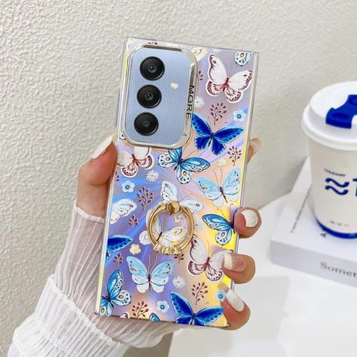 Estuche para teléfono Samsung Galaxy A25 5G con soporte para anillo de mariposa láser con galvanoplastia (Mariposas Azules)