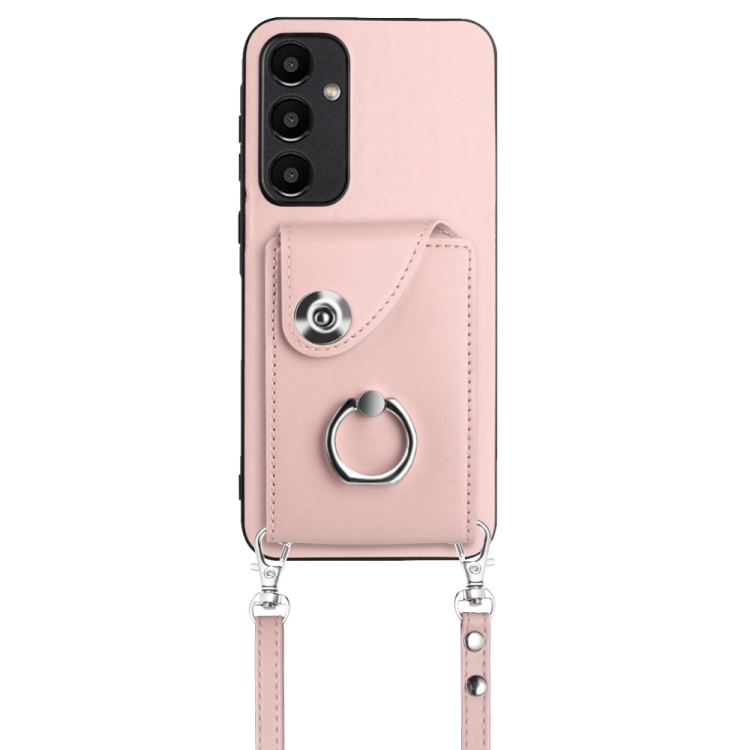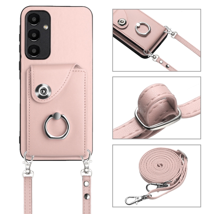Funda para teléfono Samsung Galaxy A55 con soporte para anillo y bolsa para tarjeta con cordón largo (Rosa)