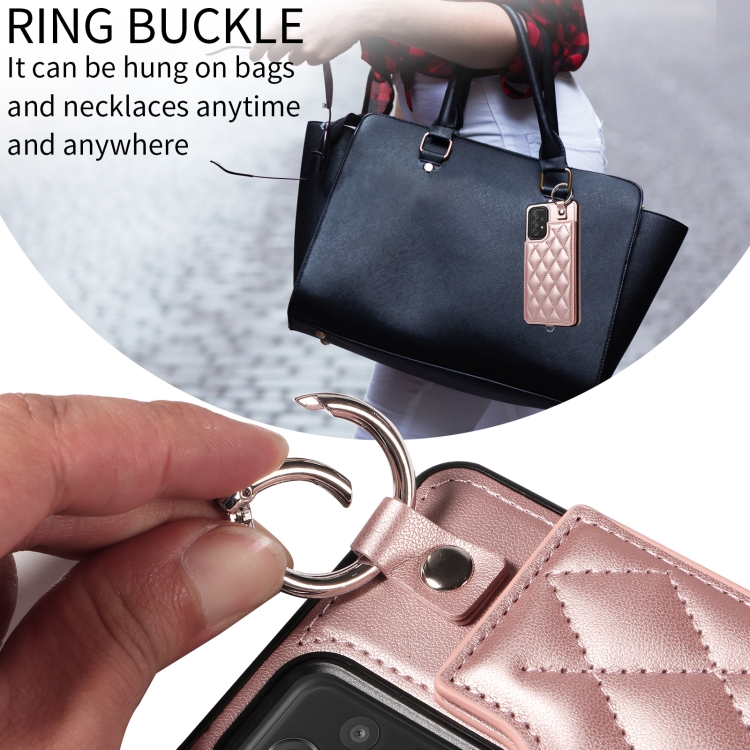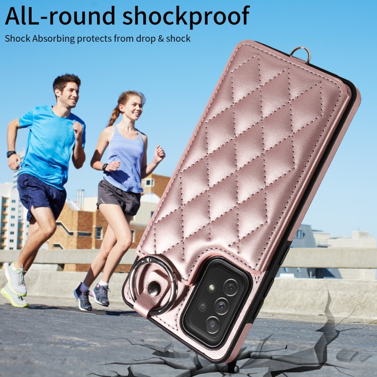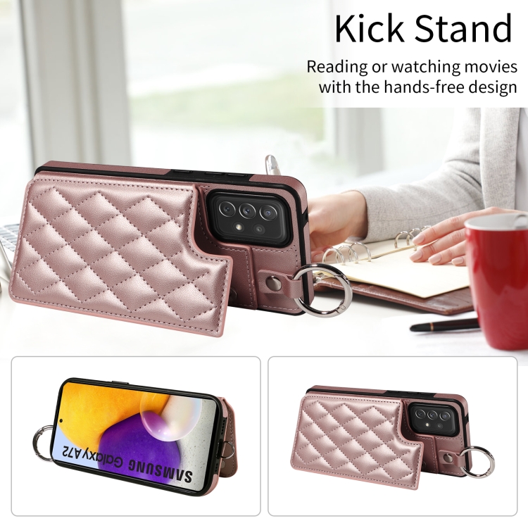 Estuche para Teléfono Samsung Galaxy A72 4G 5G con Bolsa para Tarjetas Textura Rómbica y Cordón Corto (Oro Rosa)