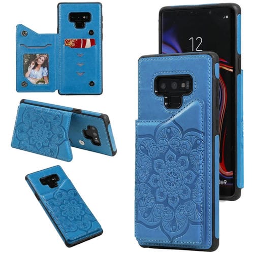 Estuche protector para Samsung Galaxy Note 9 con patrón en relieve, soporte, ranuras para tarjetas y marco de fotos (Azul)