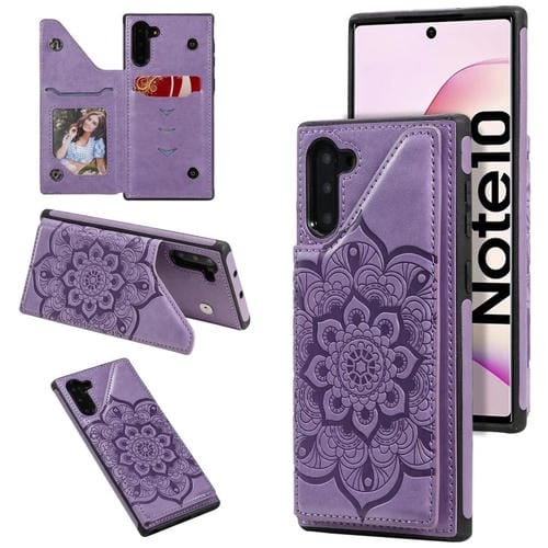 Estuche protector para Samsung Galaxy Note10 Flor Patrón en Relieve a Prueba de Golpes con Soporte y Ranuras para Tarjetas y Marco de Fotos (Púrpura)