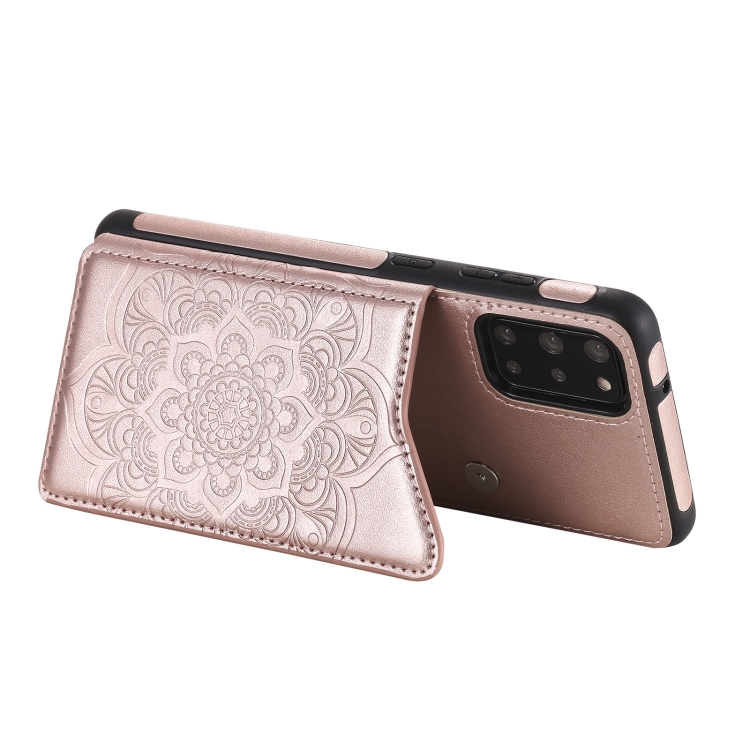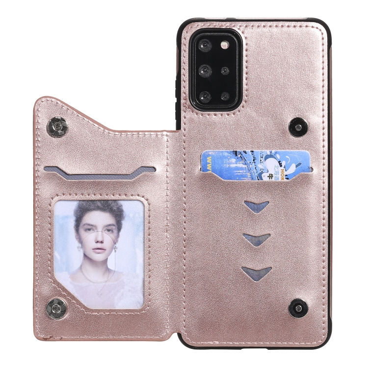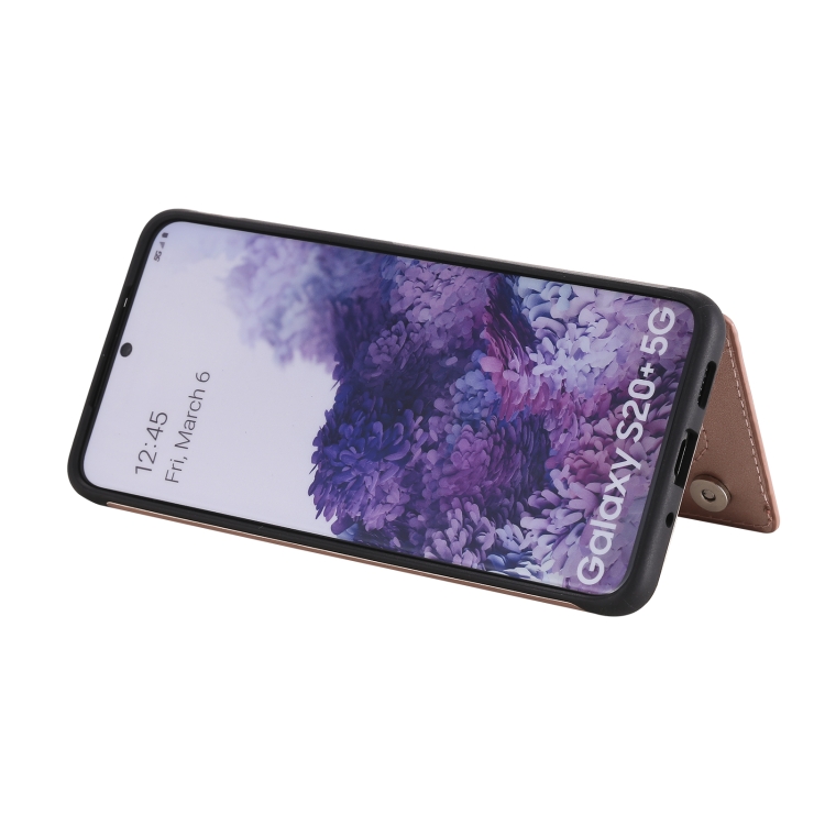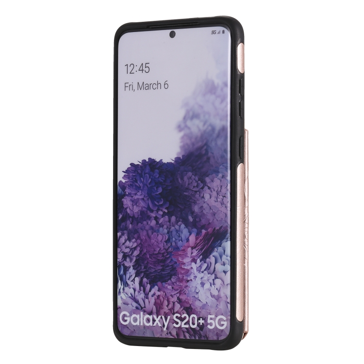 Estuche protector Samsung Galaxy S20 + con estampado en relieve, soporte, tarjetero y marco de fotos (Oro Rosa)