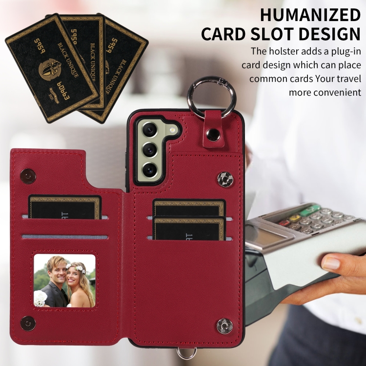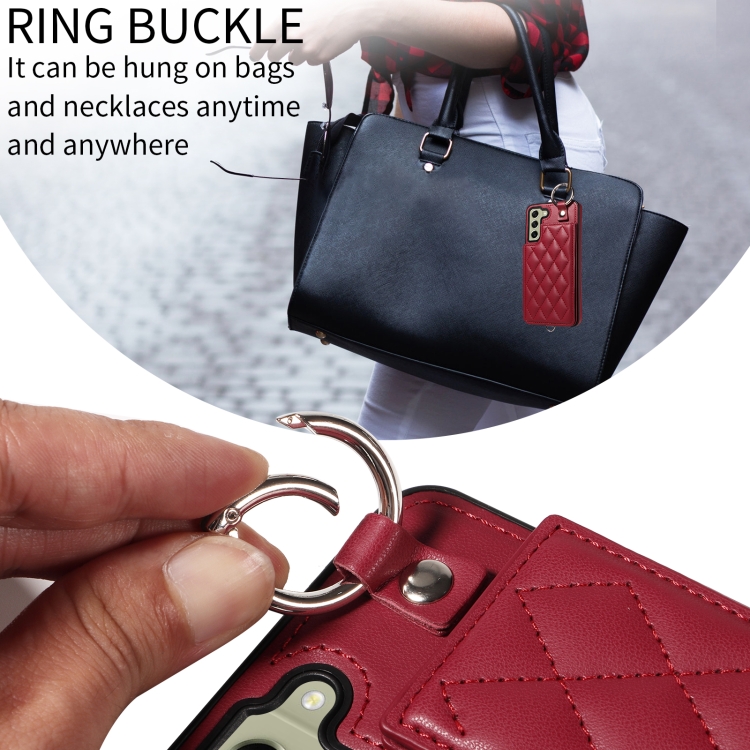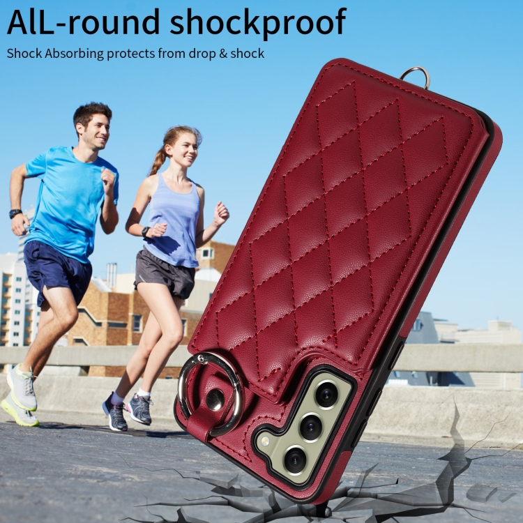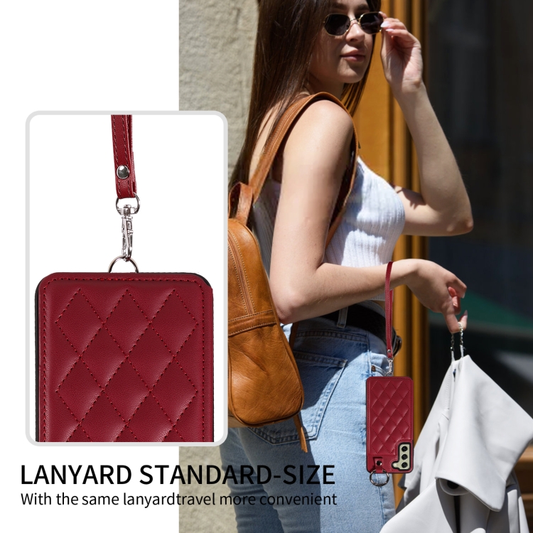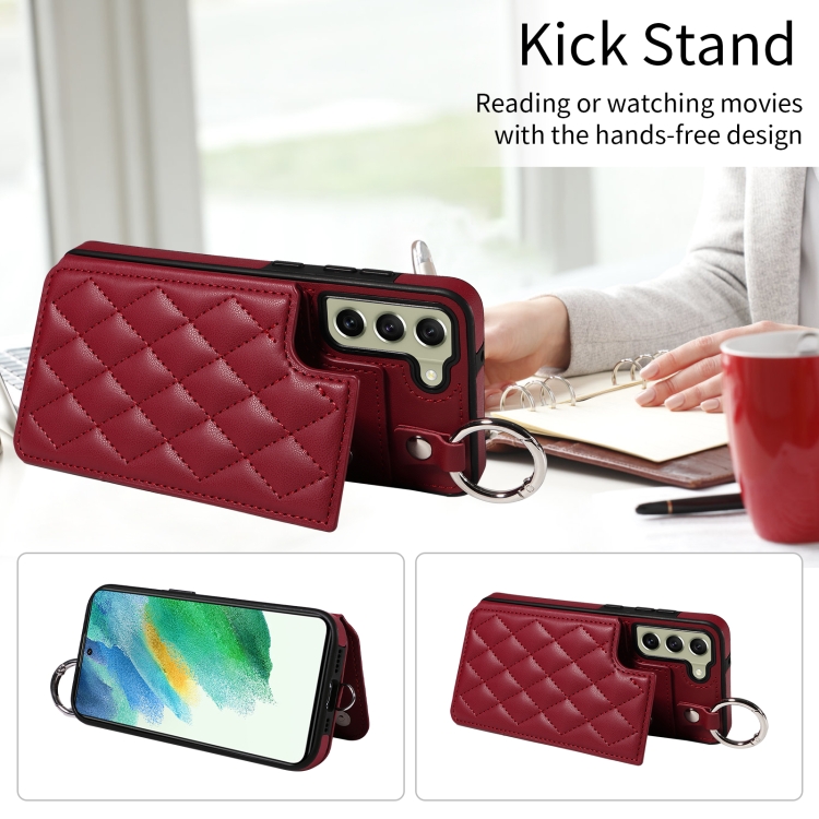 Estuche para Teléfono Samsung Galaxy S21 FE 5G con Bolsa para Tarjetas Textura Rómbica y Cordón Corto (Rojo Vino)