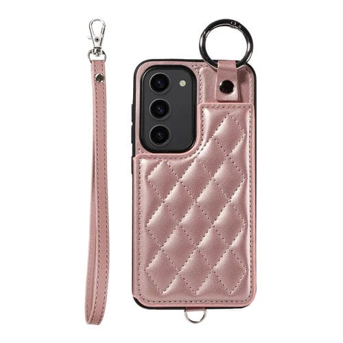 Estuche para Teléfono Samsung Galaxy S23 5G con Bolsa para Tarjetas Textura Rómbica y Cordón Corto (Oro Rosa)