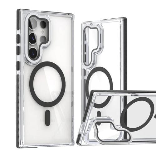 Estuche para teléfono Samsung Galaxy S24 Ultra 5G con película de lente Magsafe híbrido acrílico transparente doble color con soporte (Negro)