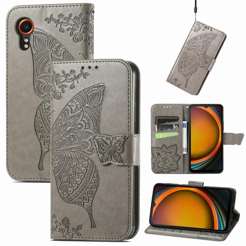 Funda para Teléfono Samsung Galaxy Xcover 7 Cuero Relieve Flor de Amor y Mariposa (Gris)