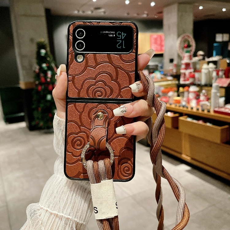 Funda Protectora Samsung Galaxy Z Flip3 5G Patrón Camelia con Cordón Largo y Anillo de Diamante (Marrón)