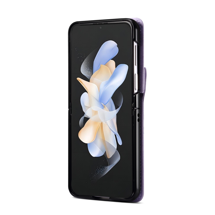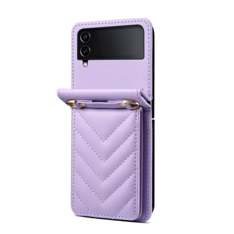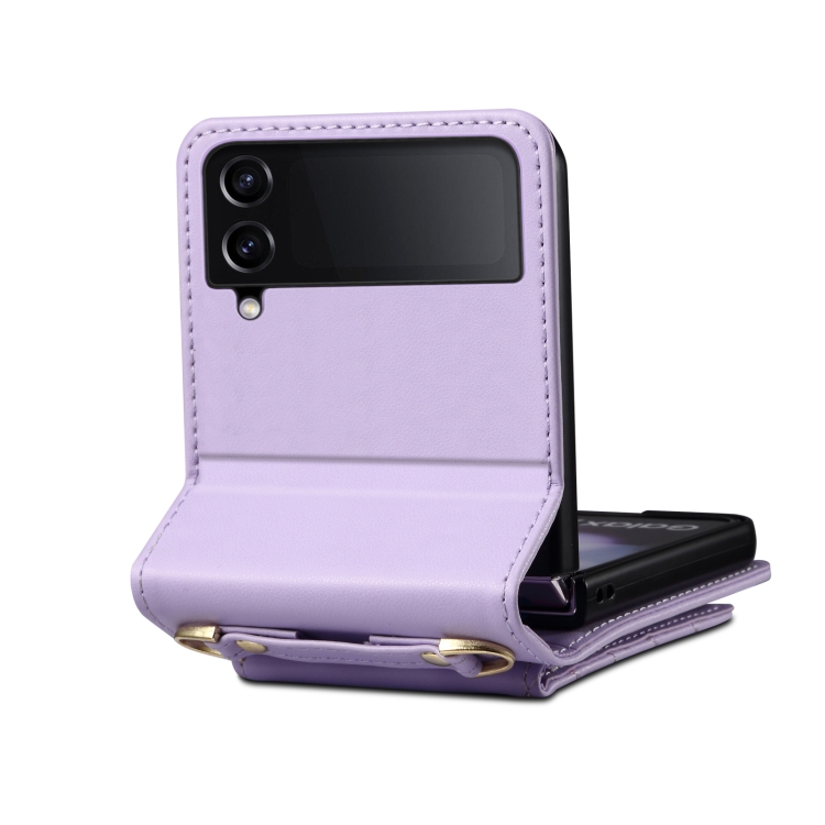 Estuche para teléfono Samsung Galaxy Z Flip4 Cuero Plegable Rómbico con Cordón Largo (Púrpura)