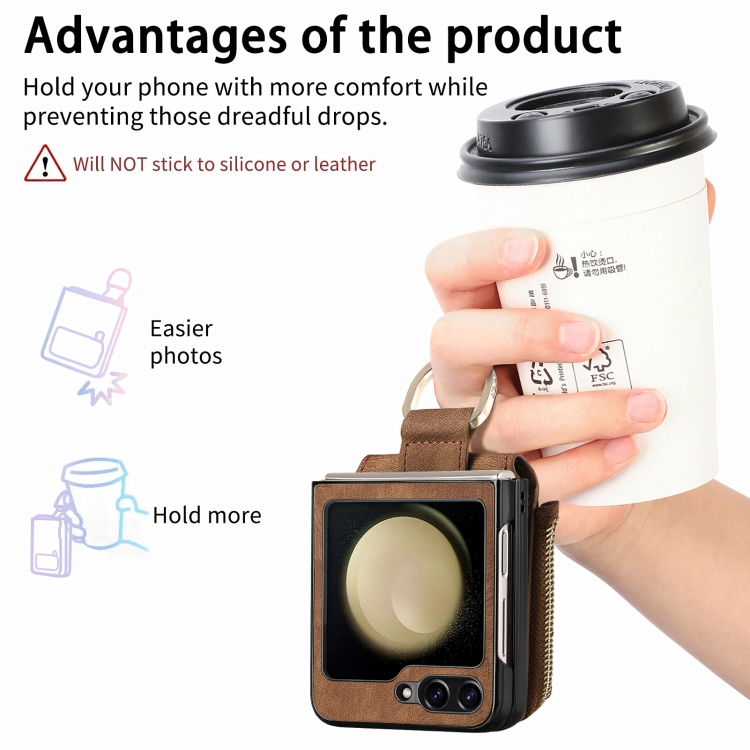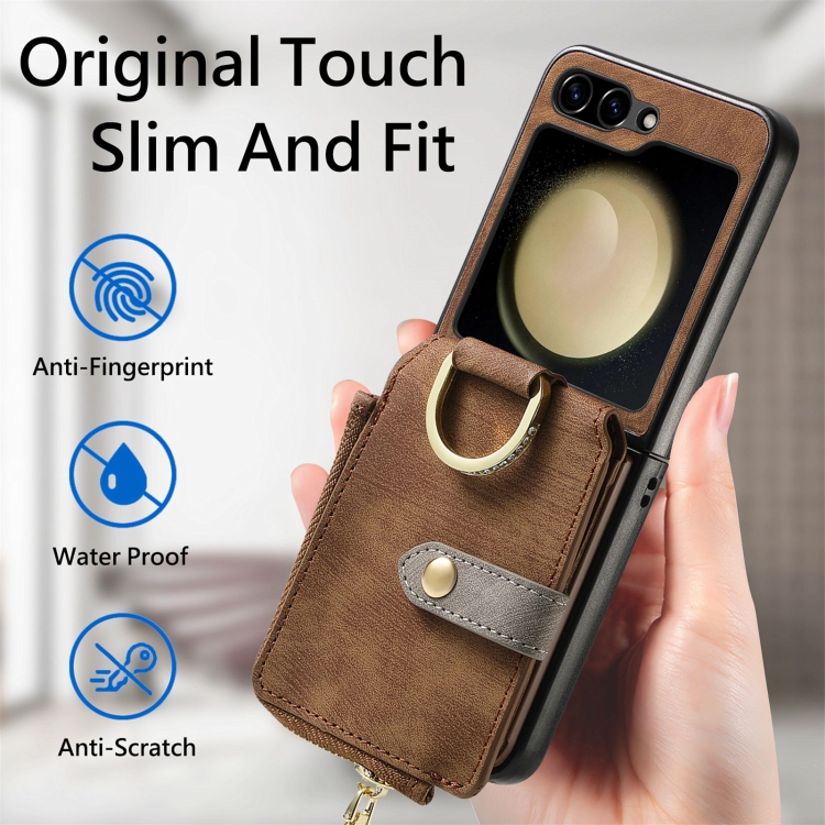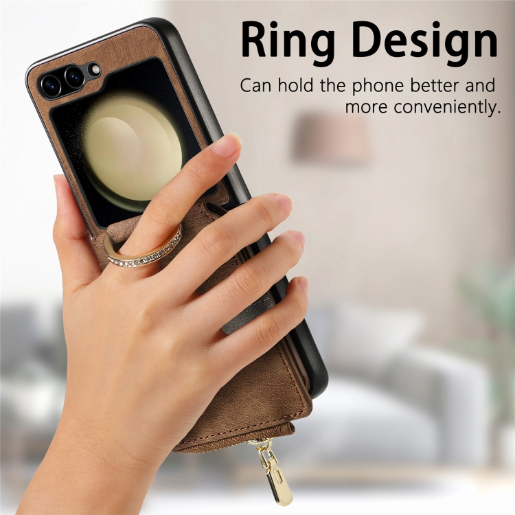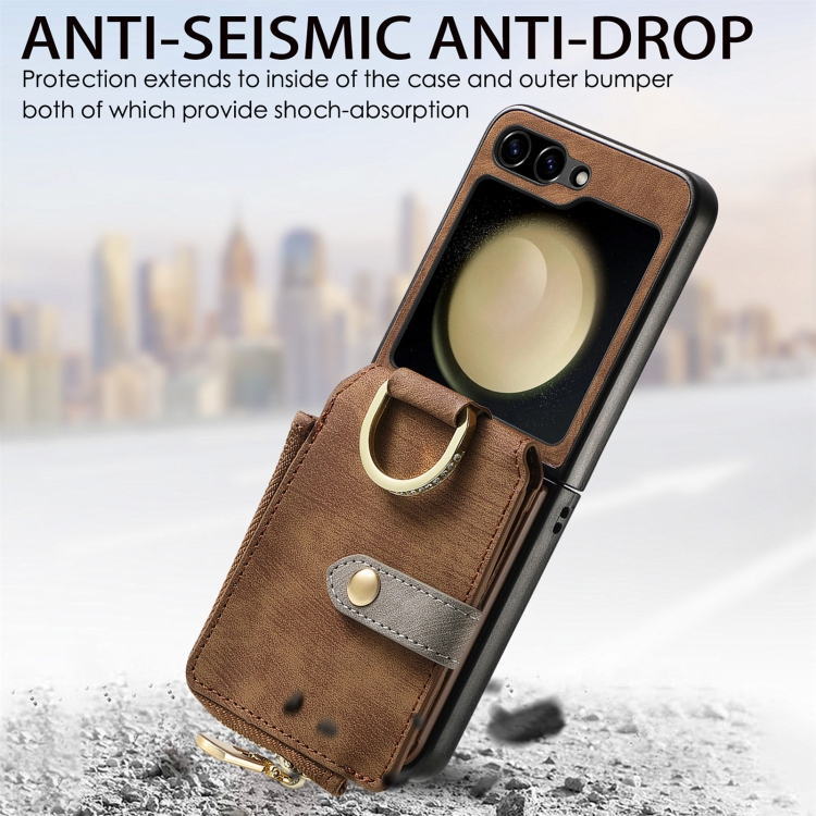 Funda para Teléfono Samsung Galaxy Z Flip5 5G con Billetera, Cremallera y Anillo con Sensación de Piel Retro (Marrón)