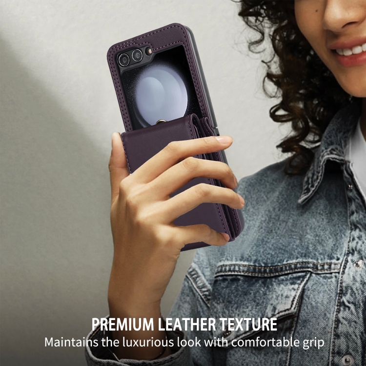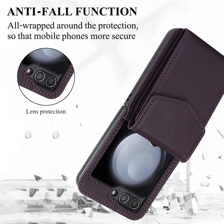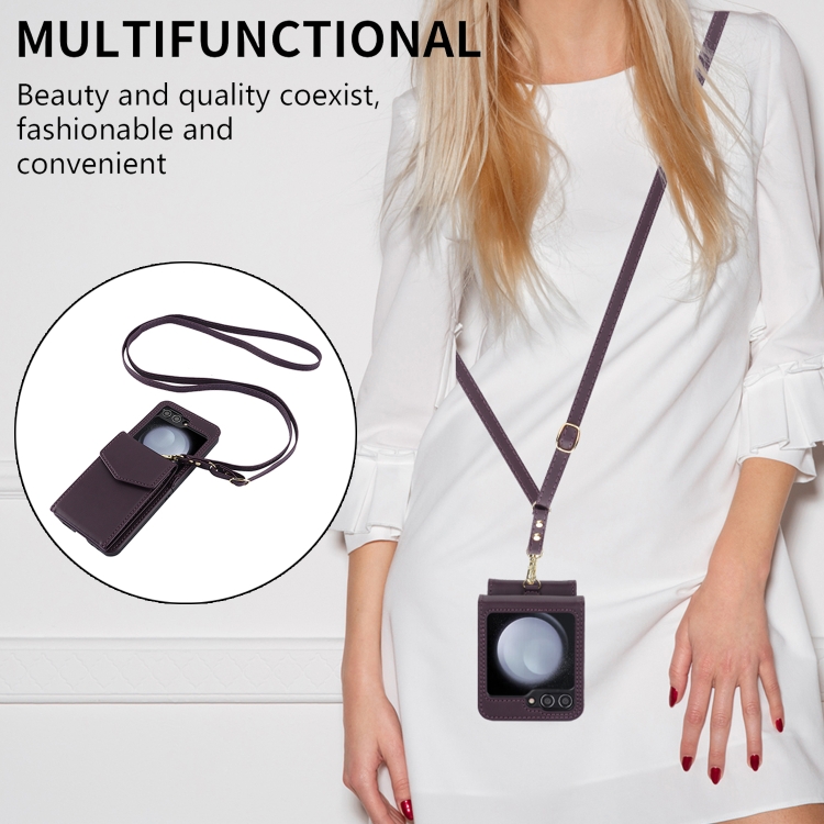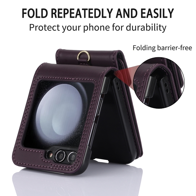 Funda plegable para Samsung Galaxy Z Flip5 con RFID, ranuras para tarjetas y cordón largo (Púrpura Oscuro)