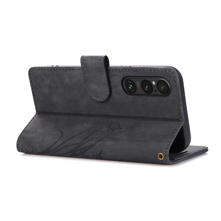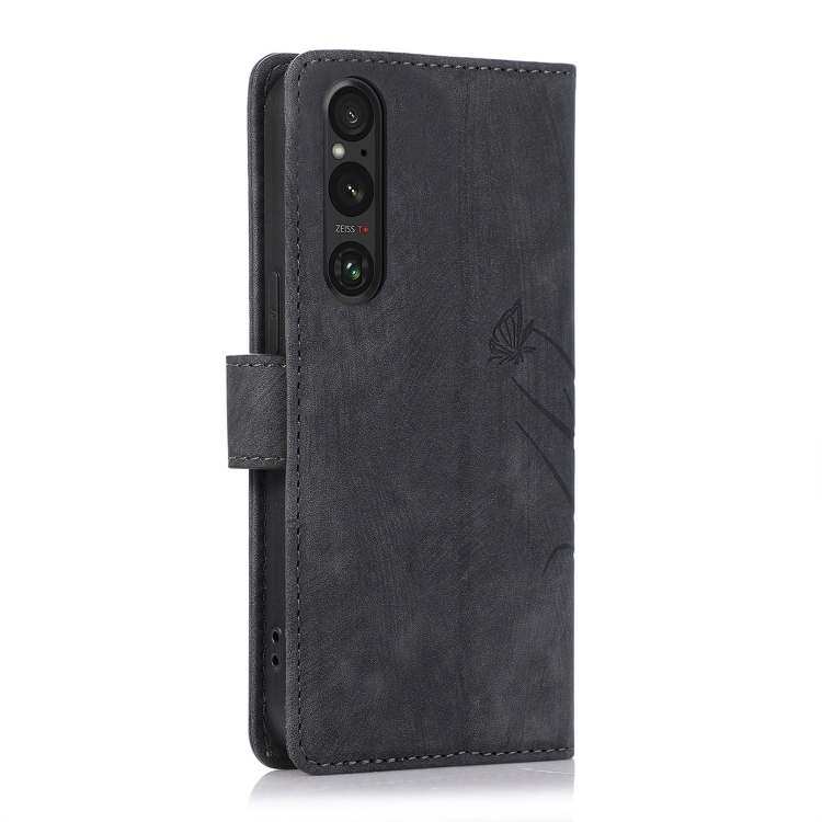 Funda para Sony Xperia 1 V 5G (2023) de Cuero con Relieve Mariposa Orquídea (Negro)