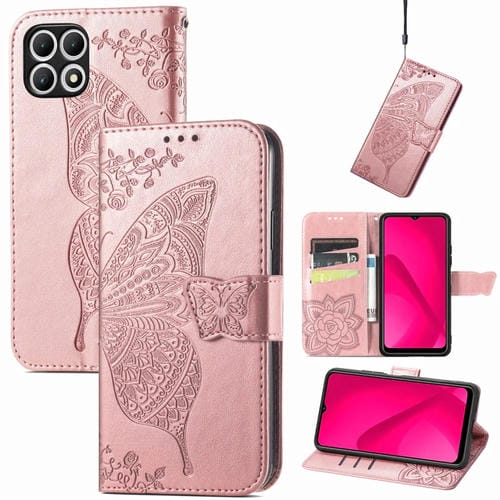 Funda para T-Mobile T Phone 2 5G de Cuero con Relieve de Flor y Mariposa (Oro Rosa)