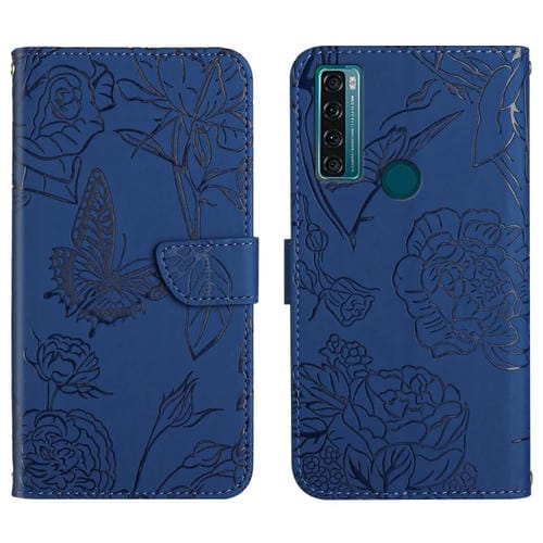 Funda de Cuero para TCL 20 Se con Relieve de Peonía y Mariposa (Azul)