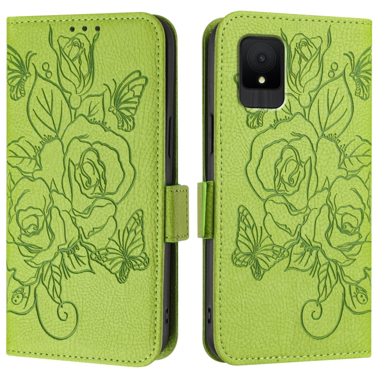 Funda de Cuero Antirrobo RFID para TCL 502 con Rosa en Relieve (Verde)