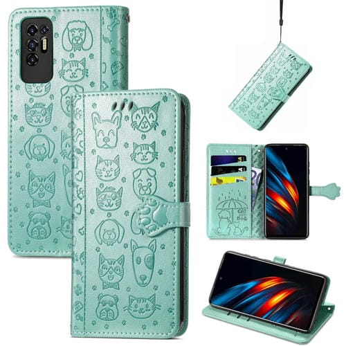 Funda para Tecno Pova 2 de Cuero Horizontal con Soporte, Billetera, Tragamonedas y Cordón Estampado Gato y Perro (Verde)
