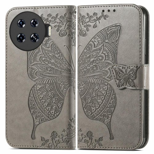 Funda para Tecno Spark 20 Pro de Cuero con Relieve Flor y Mariposa (Gris)
