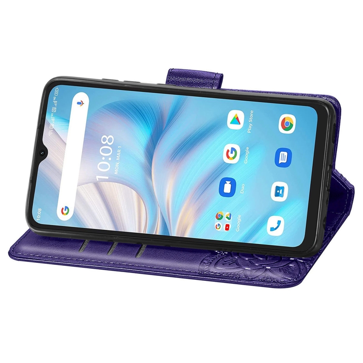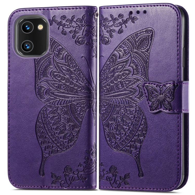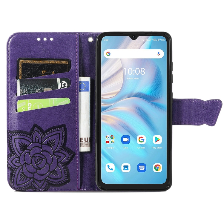 Estuche para Umidigi A13S Butterfly Love Flower de Cuero en Relieve (Púrpura)
