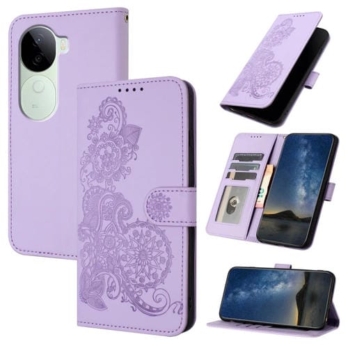 Para Vivo Iqoo Z9S / V40E India Datura Flower Funda de Cuero con Tapa En Relieve (Púrpura)