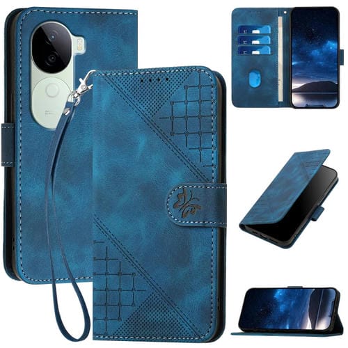 Para Vivo Iqoo Z9S / V40E India Yx0080 Funda de Cuero con Tapa y Patrón En Relieve de Mariposa y Cuadrícula con Cordón (Azul Oscuro)