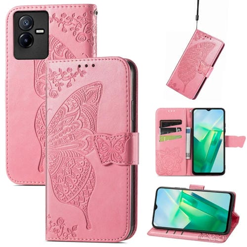 Para Vivo T2X 5G Butterfly Love Flower Estuche para Teléfono de Cuero En Relieve (Rosa)