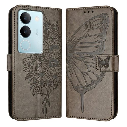 Para Vivo V29 5G Global / V29 Pro Funda de Cuero para Teléfono con Mariposa En Relieve (Gris)
