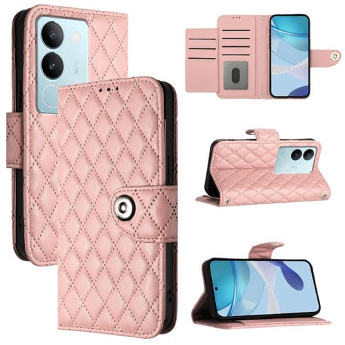 Para Vivo V29 / V29 Pro Funda para Teléfono de Cuero con Tapa con Textura Rómbica y Cordón (Rosa Coral)