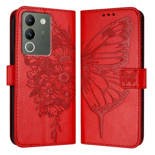 Para Vivo V29E 5G Global / Y200 5G Global Funda de Cuero para Teléfono con Mariposa En Relieve (Rojo)