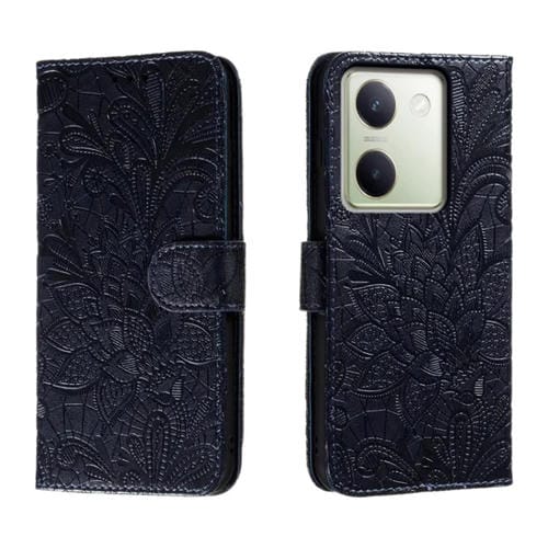 Para Vivo Y100 5G Funda para Teléfono de Cuero con Tapa y Estampado de Flores de Encaje (Azul Oscuro)