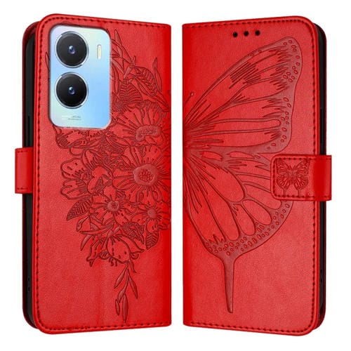 Para Vivo Y56 5G / Y16 4G / Y02S 4G Funda para Teléfono de Cuero con Mariposa En Relieve Global (Rojo)