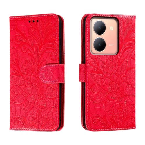 Para Vivo Y78 Funda para Teléfono de Cuero con Tapa y Estampado de Flores de Encaje (Rojo)
