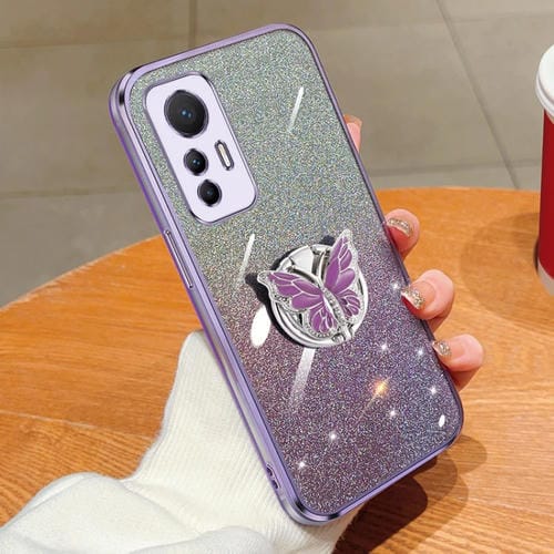 Para Xiaomi 12 Lite Funda para Teléfono de TPU con Soporte de Mariposa con Brillo Degradado Plateado (Púrpura)