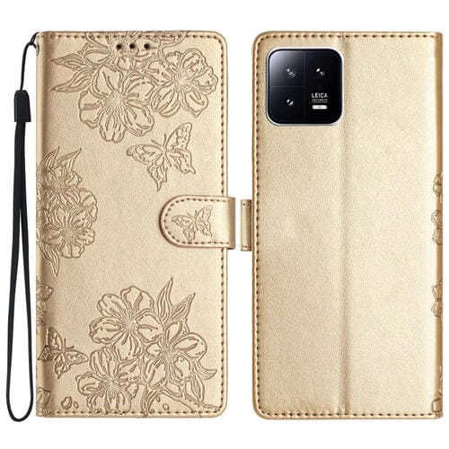 Para Xiaomi 13 Cherry Blossom Butterfly Skin Feel Funda para Teléfono de Pu En Relieve (Oro)