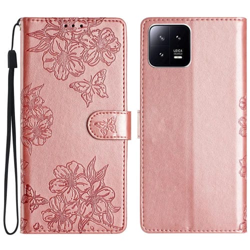 Para Xiaomi 13 Cherry Blossom Butterfly Skin Feel Funda para Teléfono de Pu En Relieve (Oro Rosa)