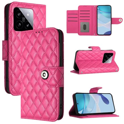 Para Xiaomi 14 Funda De Teléfono De Cuero Con Tapa Con Textura Rómbica Y Cordón (Rojo Rosa)
