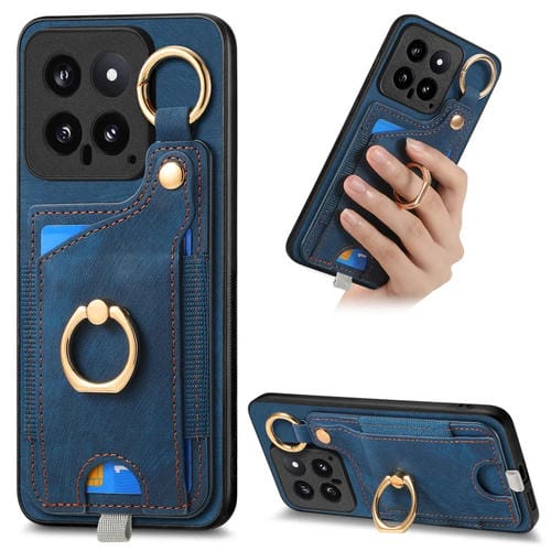 Para Xiaomi 14 Funda Para Teléfono Con Bolsa Para Tarjeta Con Anillo Y Sensación De Piel Retro Con Lazo Para Colgar (Azul)