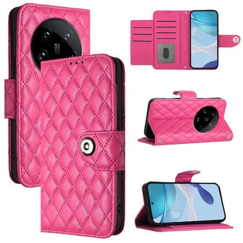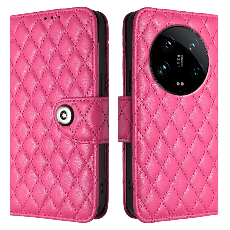 Para Xiaomi 14 Funda Para Teléfono De Cuero Con Tapa Con Textura Ultra Rómbica Y Cordón (Rojo Rosa)